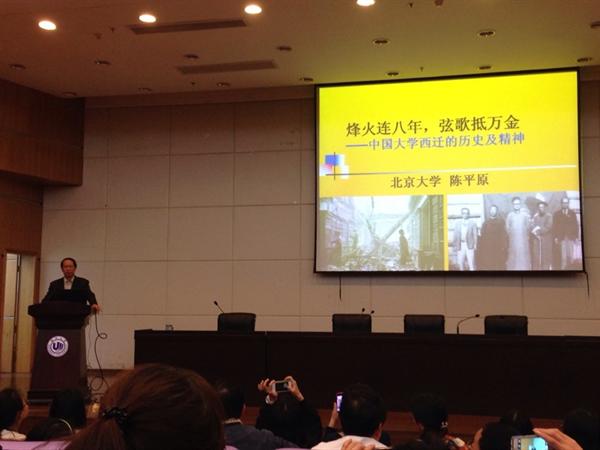 晚上7:50,陈平原教授以“烽火连八年,弦歌抵万金”为题讲演中国大学西迁的历史及精神。陈教授的讲演分五个部分为我们呈现了抗战时期中国大学的面貌和精神:一、“炸不垮的中国大学”,介绍了抗战时期中国大学的生存境况;二、“大学的迁徙路线”,以清华、北大、南开,浙江大学,中山大学等著名学府为例,介绍了其西迁路线;三、“笔落如何‘惊风雨’”,介绍了大学西迁后的教学和发展;四、“教育史上的奇迹”,对战时大学西迁的历史进行描述;五、值得思考和反省的若干问题。孙良好教授以“活泼的语言、生动的细节、翔实的资料、开阔的视野、清晰的思路”对陈教授的讲演进行评述,称道这样的讲座在“大学失精神”的今天,可谓直抵听众的灵魂。