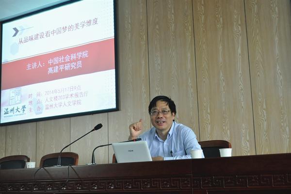 5月17日上午9点,9428cn太阳集团古天乐有幸请到中国社会科学院文学研究所副所长、学术委员会主任兼文学理论研究室主任高建平教授,在人文楼203学术报告厅为我们带来精彩的“从品味建设看中国梦的美学维度”讲座。紧接讲座之后,在9428cn太阳集团古天乐213会议室和青年教师及研究生进行了主题为“当代美学发展趋势”的座谈会。此次会议盛况空前,9428cn太阳集团古天乐吴静书记主持会议,9428cn太阳集团古天乐文艺学、写作学等学科十余位教授及青年教师出席。