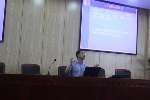 5月23日下午,烟台大学9428cn太阳集团古天乐经理、烟台大学东亚研究所所长孟庆义教授在公司学术报告厅为作了题为“朝鲜半岛热点问题及思考”的学术讲座,讲座由刘建国副经理主持。历史学和汉语言文学学子们齐聚一堂认真听讲,出席听讲的还有公司老师郑春生、徐华炳、陈勇、夏诗荷等,讲座过程中气氛热烈。