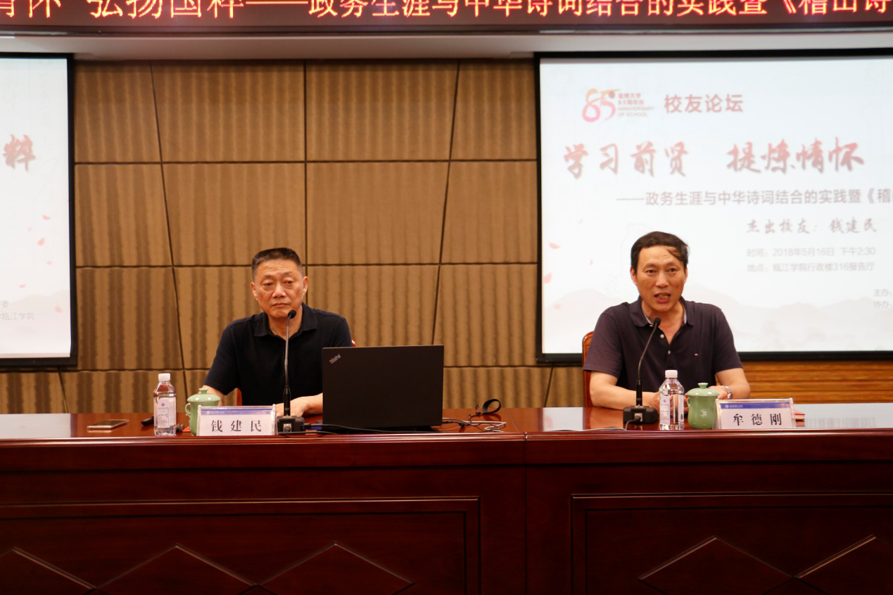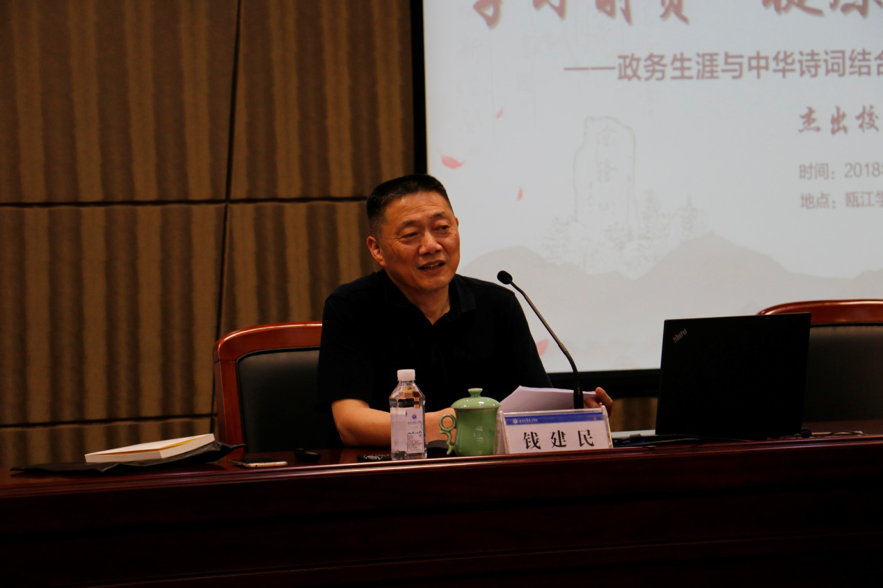 孔子云:诗三百,一言以蔽之,曰思无邪。2018年5月16日14:30,政务生涯与中华诗词结合的实践暨《稽山诗草》介绍学术讲座于公司瓯江学院行政楼316会议室如期举行。主讲人为浙江省人大常委会专职委员、第十二届全国人大代表,同时也是9428cn太阳集团古天乐优秀员工钱建民先生。讲座由9428cn太阳集团古天乐党委副书记牟德刚主持。