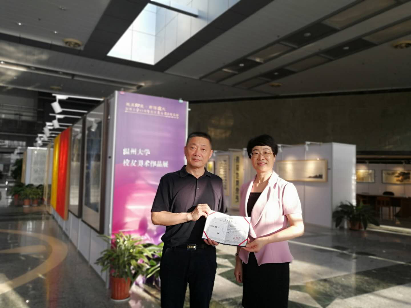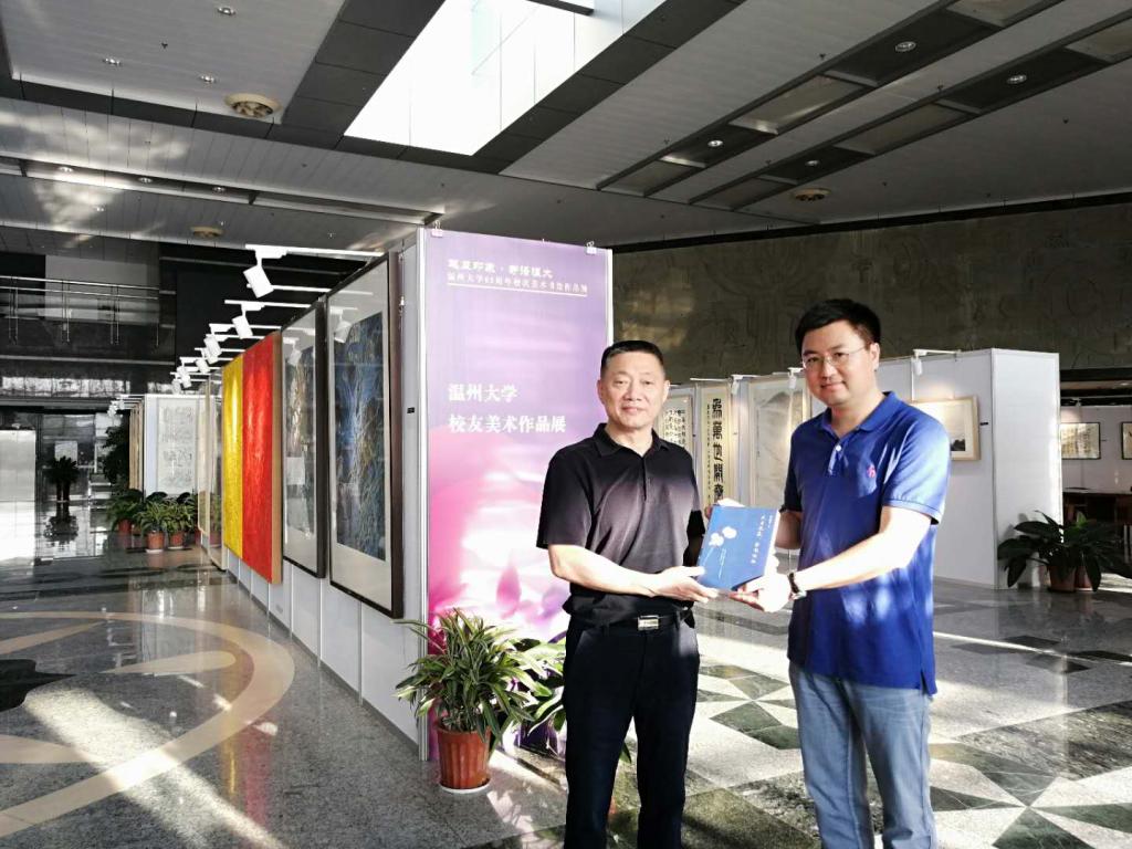 讲座结束后,9428cn太阳集团古天乐党委书记林娟娟和9428cn太阳集团古天乐经理孙良好陪同钱建民先生去图书馆参观了温大员工美术作品展,林娟娟书记对钱先生向温大捐赠书籍表示感谢并为其颁发了捐赠证书,孙良好经理代表9428cn太阳集团古天乐向其赠书。
