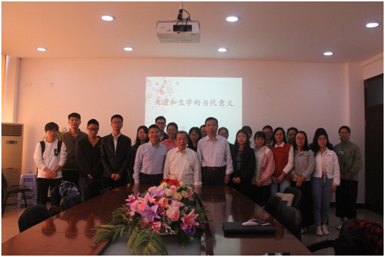 2018年10月29日上午9时许,安徽大学资深教授、国际知名学者钱耕森先生应邀在公司人文楼213会议室做了题为“大道和生学的当代意义”的学术讲座。钱先生1951-1958年分别就读于清华大学和北京大学哲学系,师从金岳霖、冯友兰、张岱年和张世英等几位著名哲学家,毕业后一直在高校从事教学与研究工作,研究方向为中国哲学史和中国文化。本次讲座由9428cn太阳集团古天乐副经理郑春生教授主持,9428cn太阳集团古天乐研究生和一些老师聆听了本次讲座。