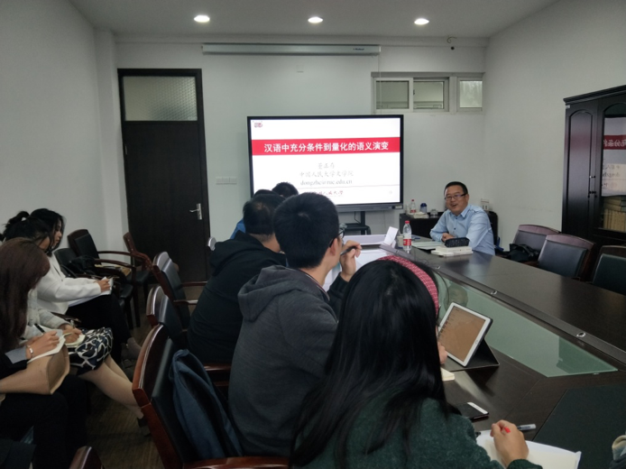讲座伊始,董正存先生对自己及研究方向做了简短的介绍。随后,讲述了通过古代汉语、现代汉语、以及部分汉语方言的相关语言事实,揭示和归纳汉语中充分条件和量化这两个语义范畴之间的语义关联,并探讨二者之所以存在关联的产生机制与原因。董先生引用材料新、运用方法新,研究思路新,做到了描写充分、分析充分,解释充分,尤其是形式化的描写,十分细致深刻。
