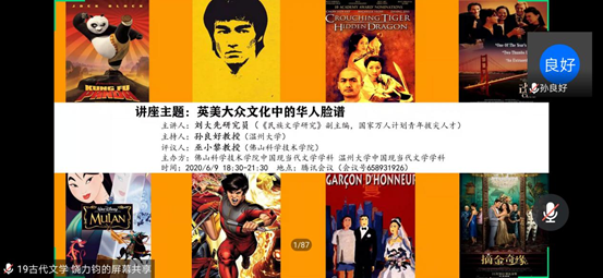 6月9日晚18点30分,公司中国现当代文学学科联合佛山科学技术学院现当代文学学科,特邀中国社会科学院研究员刘大先老师在腾讯会议开展《英美大众文化中的华人脸谱》主题讲座。此次讲座由公司孙良好经理主持,由佛山科学技术学院巫小黎教授点评。