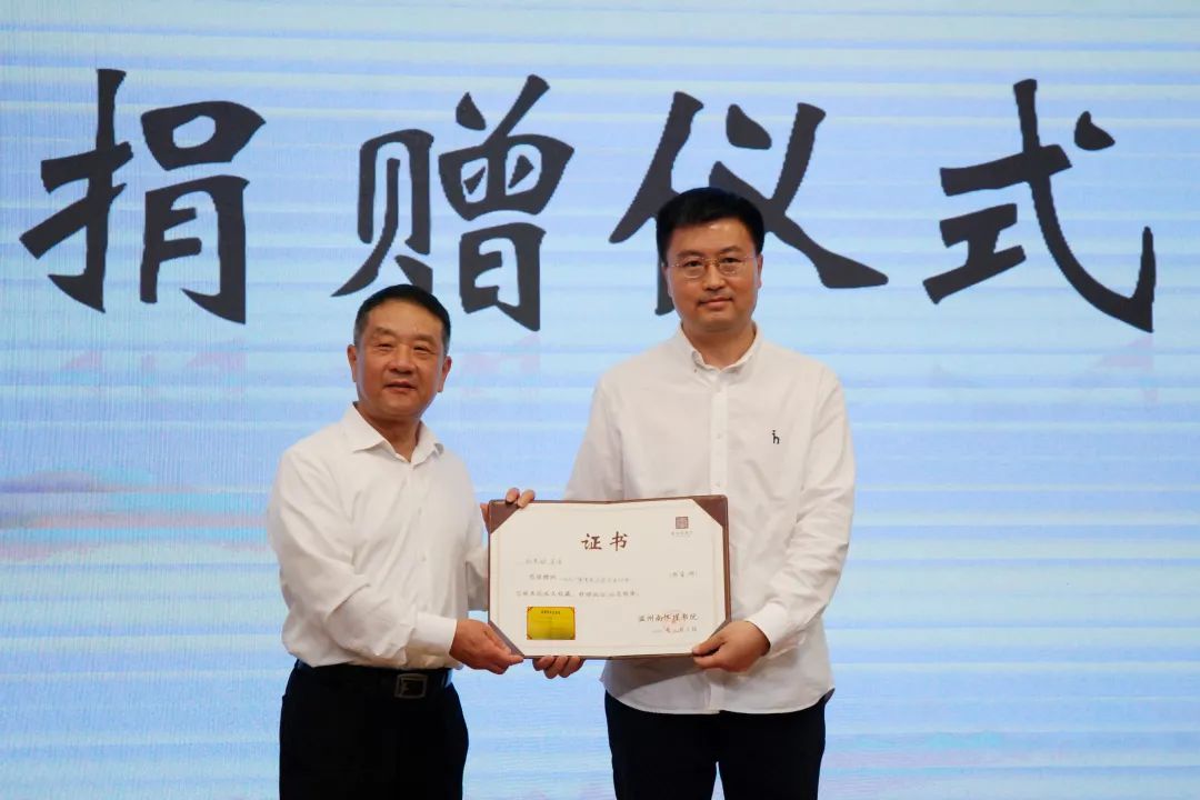孙良好经理在杭州大学读研期间,曾获光华奖学金。该奖学金是由南怀瑾先生发起并设立的,旨在奖励各知名高校的优秀学子。仪式上,孙经理特将光华奖学金证书捐赠于书院,执行经理吴东为孙经理颁发收藏证书。