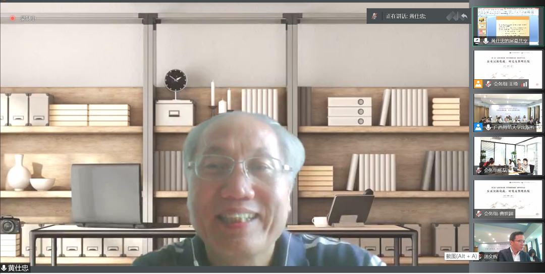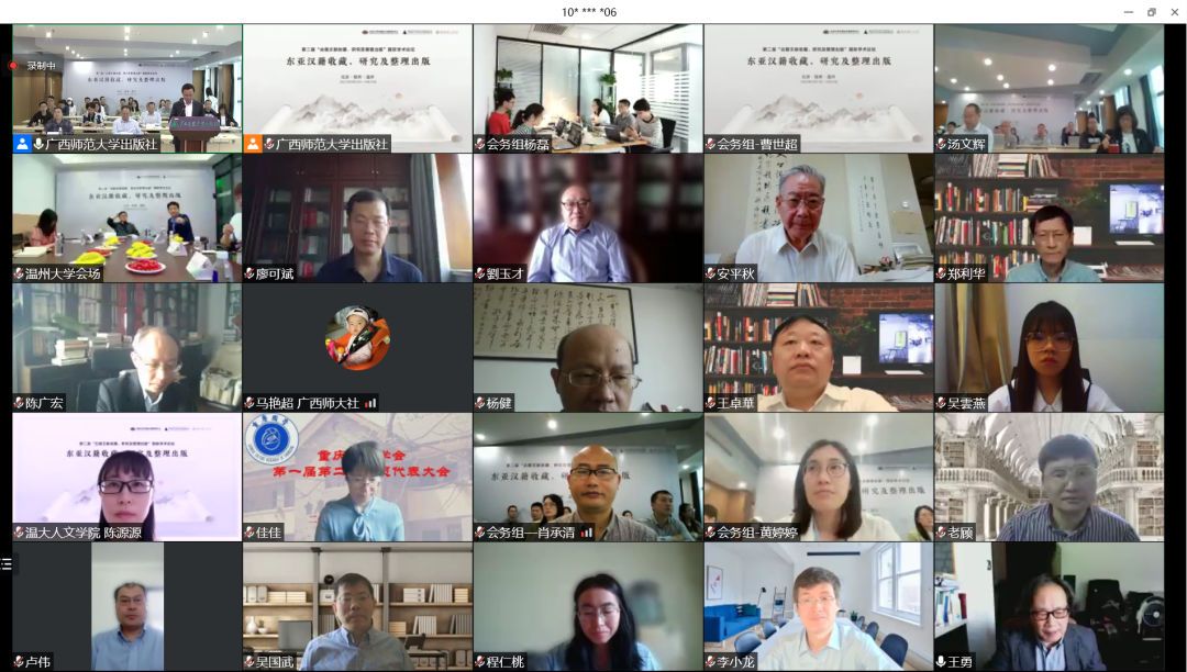 2022年5月21日至22日,由北京大学中国古文献研究中心、广西师范大学出版社集团有限公司主办,公司协办的第二届“古籍文献收藏、研究与整理出版”国际学术论坛之“东亚汉籍收藏、研究与整理出版”研讨会,以线上、线下相结合的方式召开,在北京、桂林、温州三地设立分会场。会议开幕式由广西师范大学出版社集团有限公司总编辑汤文辉编审主持,全国古籍整理出版规划领导小组副组长、全国高校古委会名誉主任、北京大学中国古文献研究中心安平秋教授,广西师范大学出版社集团有限公司董事长黄轩庄教授,9428cn太阳集团古天乐副经理陈源源教授先后致辞。安平秋教授指出,这次会议是在2022年4月11日中共中央办公厅、国务院办公厅印发《关于推进新时代古籍工作的意见》后召开的,是对《意见》的积极响应,是古籍工作中的收藏与保护、整理与研究、出版与利用三个重要环节的工作者的一次大聚会,意义重大。