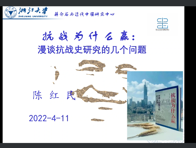 2022年6月2日18:30,浙江大学求是特聘教授、国家社科基金评委、浙江大学蒋介石与近代中国研究中心教授兼主任,博士生导师陈红民应邀为公司作学术讲座。本次讲座由刘建国教授主持,在线上开展。陈红民教授就自己的研究方向向我们介绍了有关抗战史的研究成果。