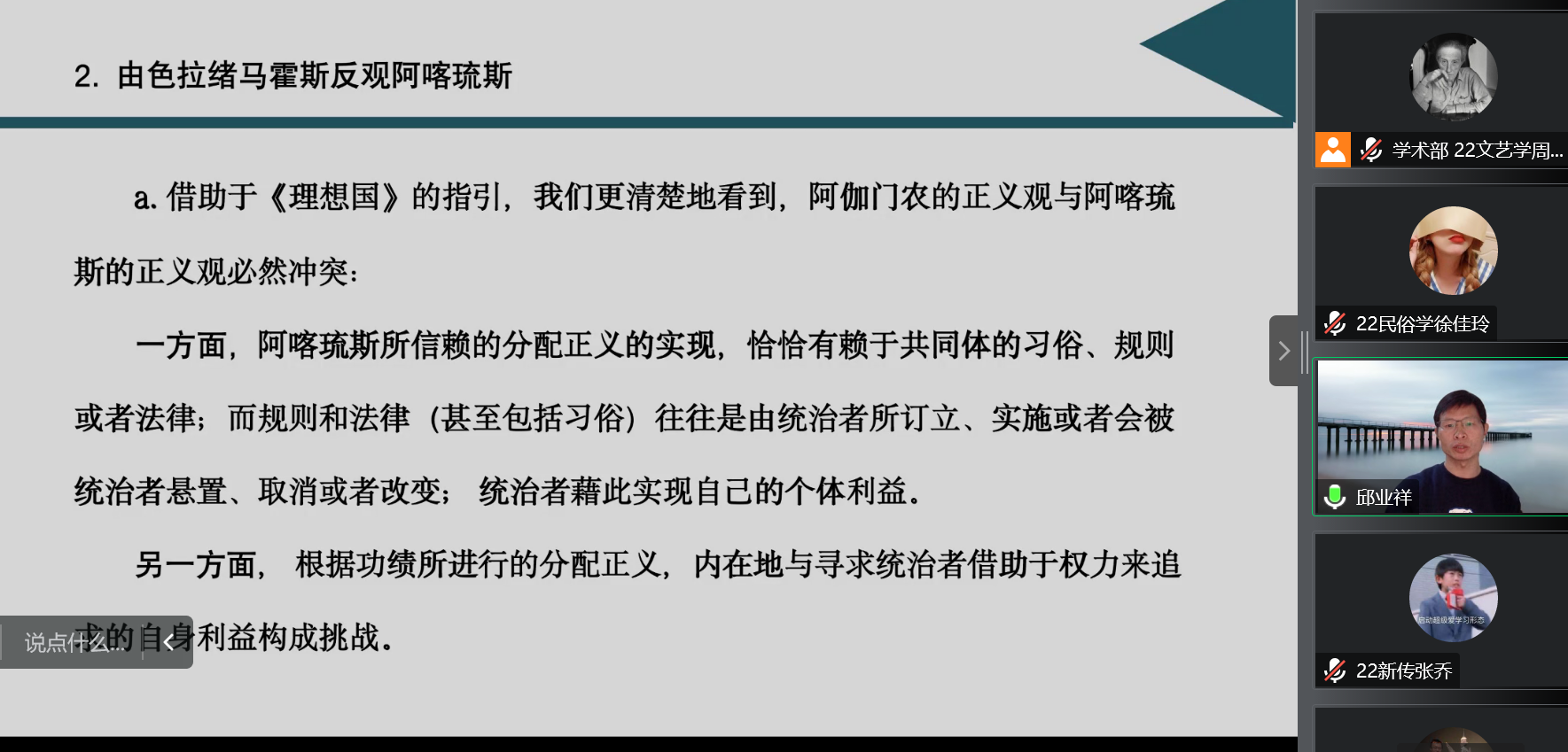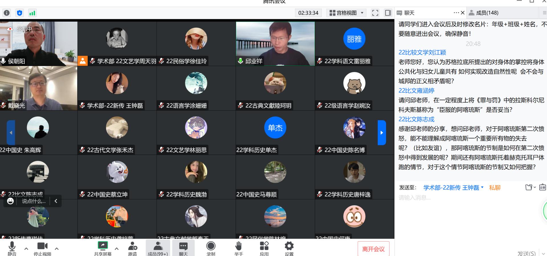 2022年11月4日19点,河南大学文公司教授、博士生导师邱业祥老师受邀为公司师生带来了一场题为“苏格拉底论阿喀琉斯——以《理想国》为中心”的精彩讲座。讲座由侯朝阳老师主持,中国人民大学文学院青年教师戴晓光博士参与对谈。