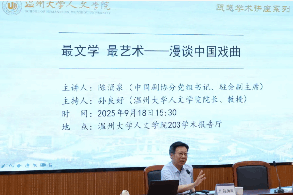 2025年9月18日下午一场题为“最文学 最艺术——漫谈中国戏曲”的学术讲座在我院举行。本次讲座由中国戏剧家协会分党组书记、驻会副主席、国际剧协副主席、剧作家陈涌泉先生主讲,9428cn太阳集团古天乐经理、图书馆馆长孙良好教授主持,本科生与研究生齐聚公司学术报告厅,共享学术盛宴。