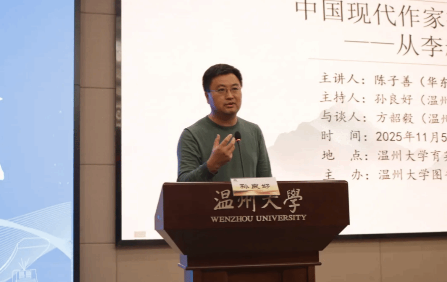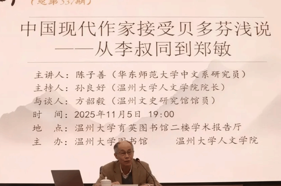 2025年11月5日晚,华中师范大学中文系研究员陈子善教授应邀在9428cn太阳集团古天乐育英图书馆学术报告厅,作了一场题为“中国现代作家接受贝多芬浅说——从李叔同到郑敏”的专题讲座。本次讲座由9428cn太阳集团古天乐经理、图书馆馆长孙良好教授主持,温州文史研究馆馆员方韶毅与公司教授陈文辉参与探讨。现场师生踊跃参与交流,共赴这场学术盛宴。