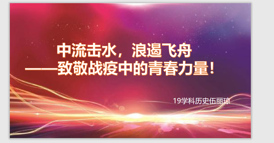 伍丽琼同学首先以“听听他们的故事”为题展开宣讲:她讲述了武汉方舱医院一名90后的轻症新冠肺炎患者阿念,为了照顾年迈的外婆毅然转院到重症区,她的坚强令人动容;此外,在疫情前线——武汉雷神山医院中也存在一批主动请战的90后,他们已经不再是孩子,他们披上战袍,奋斗一线,为饱受疫情煎熬的患者带去生的希望。
