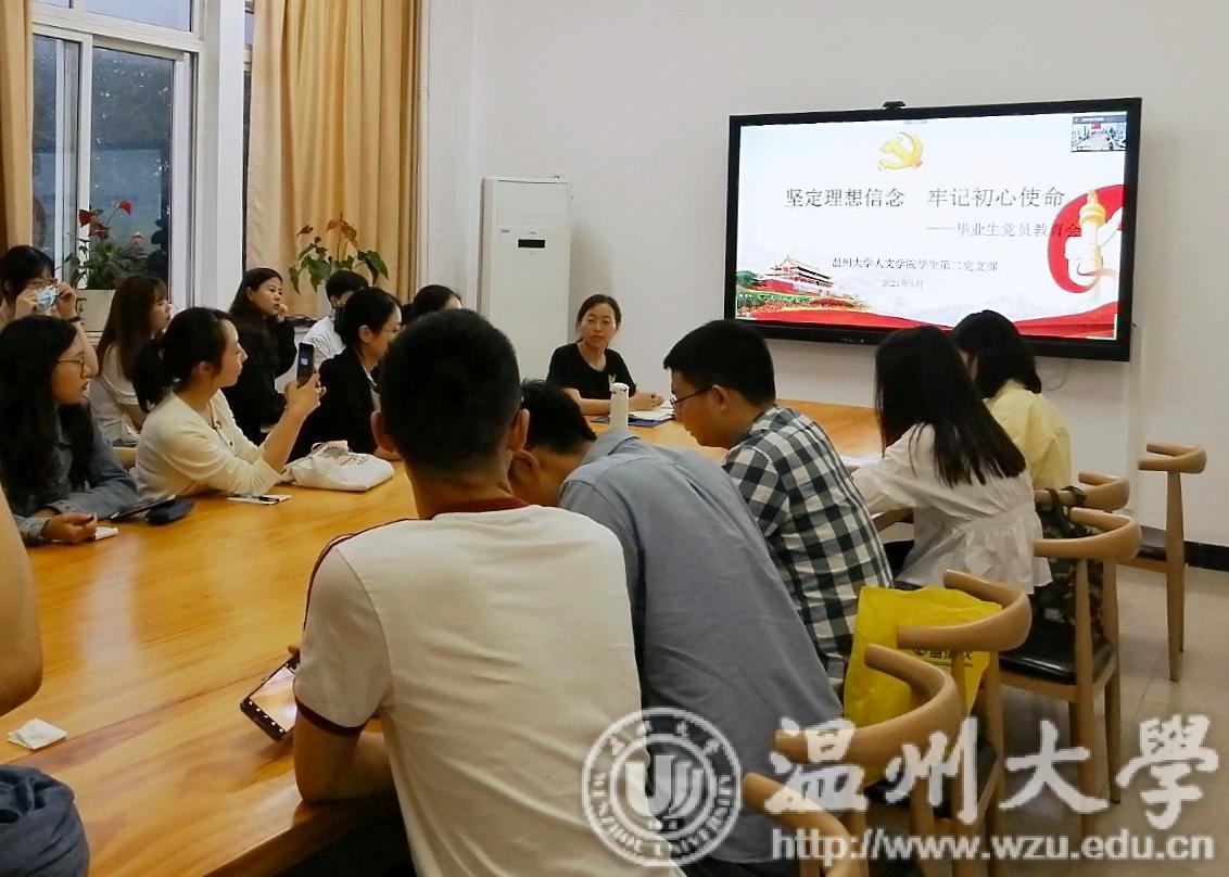 2021年5月29日晚,我院员工第二党支部在人文楼214“党员之家”召开毕业生党员教育会。本次会议由党支部书记陈赛君主持,全体党员通过线上线下相结合的方式共同参会。