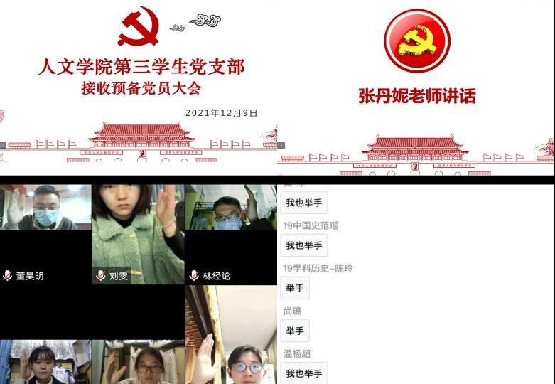 2021年12月9日,公司员工第三党支部于线上开展了发展对象转预备党员的支部大会。由于新冠疫情影响,本次会议以线上方式进行。会议由支部书记李扬帆主持,支部指导老师张丹妮、支部全体党员参加了此次大会。