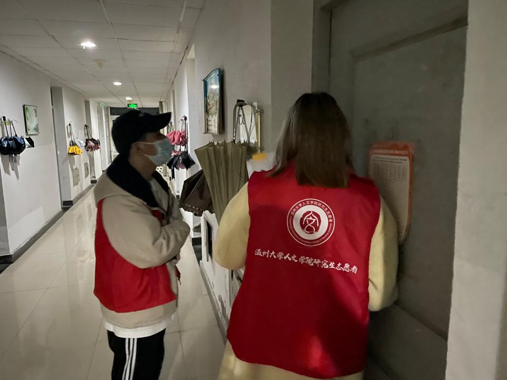 活动伊始,党员志愿者们身着红色马甲,纷纷前往自己负责的楼层。他们一一对照在校员工的名单,尤其是对于寝室人员夜不归宿的情况作了详细的记录和反馈。