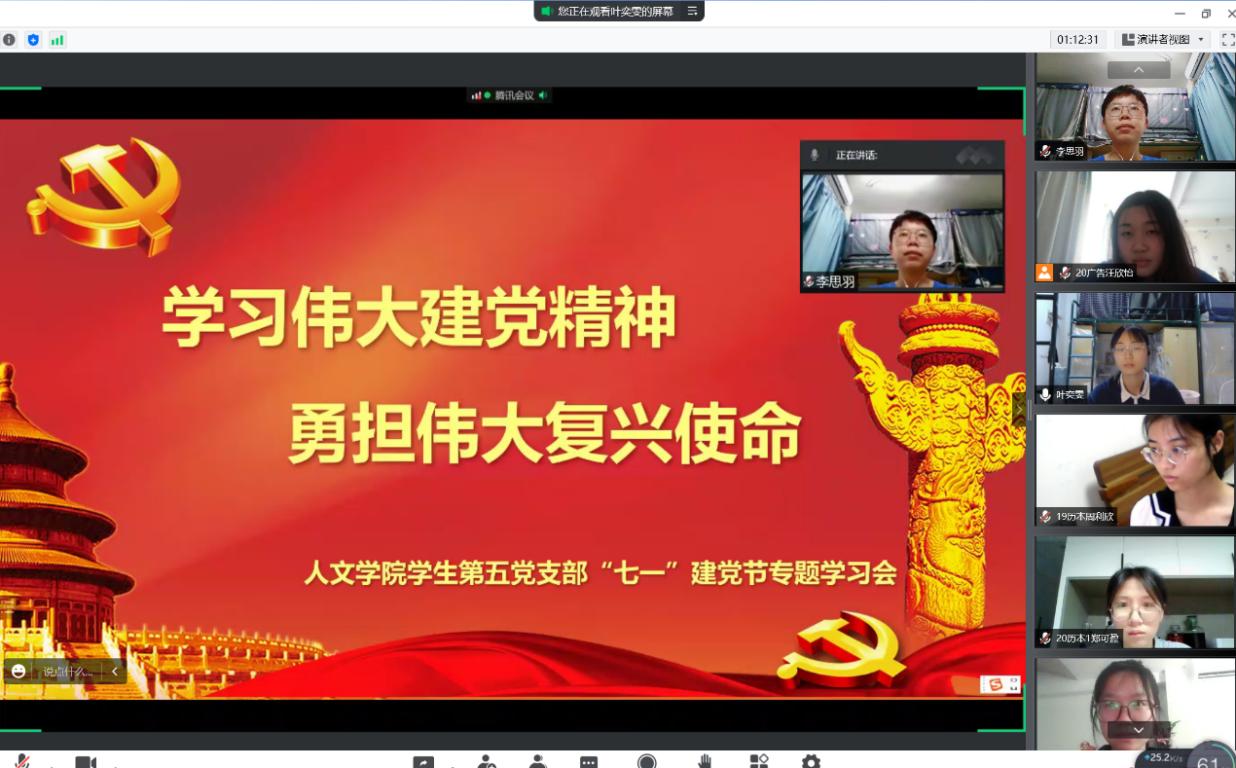 7月1日下午14:00,公司员工第五党支部在腾讯会议开展主题为“学习伟大建党精神,勇担伟大复兴使命”的专题学习会。会议由支部代理书记叶奕雯同志主持。