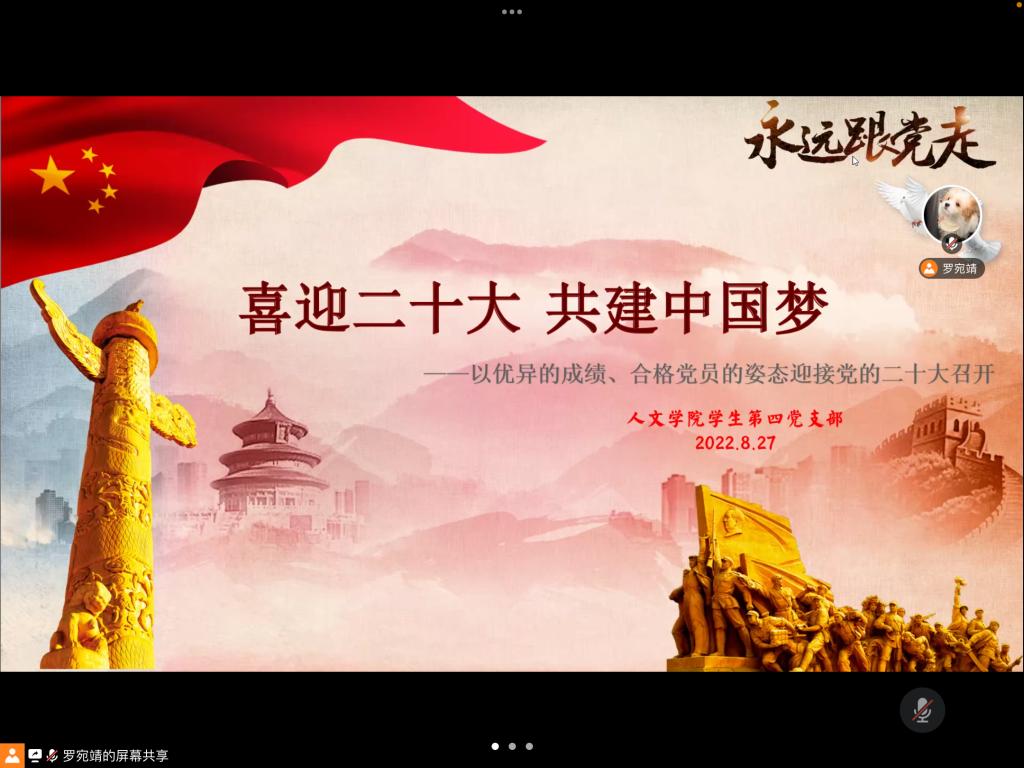 2022年8月27日19:00,为督促各位同志以合格党员的要求武装自身头脑,用合格党员的标准约束自身行为,坚定信心,勇往直前,以优异的成绩和昂扬的姿态迎接党的二十大胜利召开,公司员工第四党支部于线上开展了“喜迎二十大,共建中国梦”主题党课暨学习会。本次活动由罗宛靖同志主持,共有40名同志参加。
