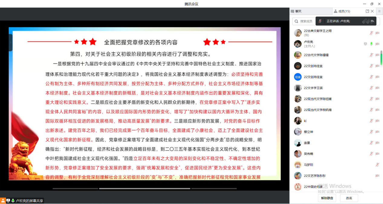 主持人带领支部成员认真学习了党的二十大对党章作出修改的部分,主要包括以下六个方面:第一,充实完善习近平新时代中国特色社会主义思想的科学内涵和历史定位;第二,把“两个结合”这一马克思主义中国化时代化的规律性认识写入党章;第三,把党百年奋斗的重大成就和历史经验写入党章;第四,对关于社会主义初级阶段的相关内容进行了调整和充实;第五,增写了坚持和加强党的全面领导的有关内容;第六,吸收党的十九大以来全面从严治党的宝贵经验,对党的建设相关内容进行了调整充实。