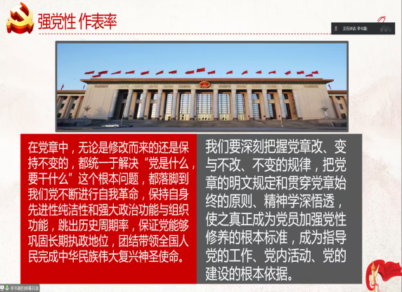 为深入学习贯彻党的二十大精神,全面领会把握新修订的《中国共产党章程》的深刻内涵,引导员工党员自觉学习并遵守各项党章党规,坚决拥护党的纲领,公司员工第六党支部于4月11日晚开展“学党章 强党性 作表率”主题党日活动。活动由党支部书记周梦淏主持。