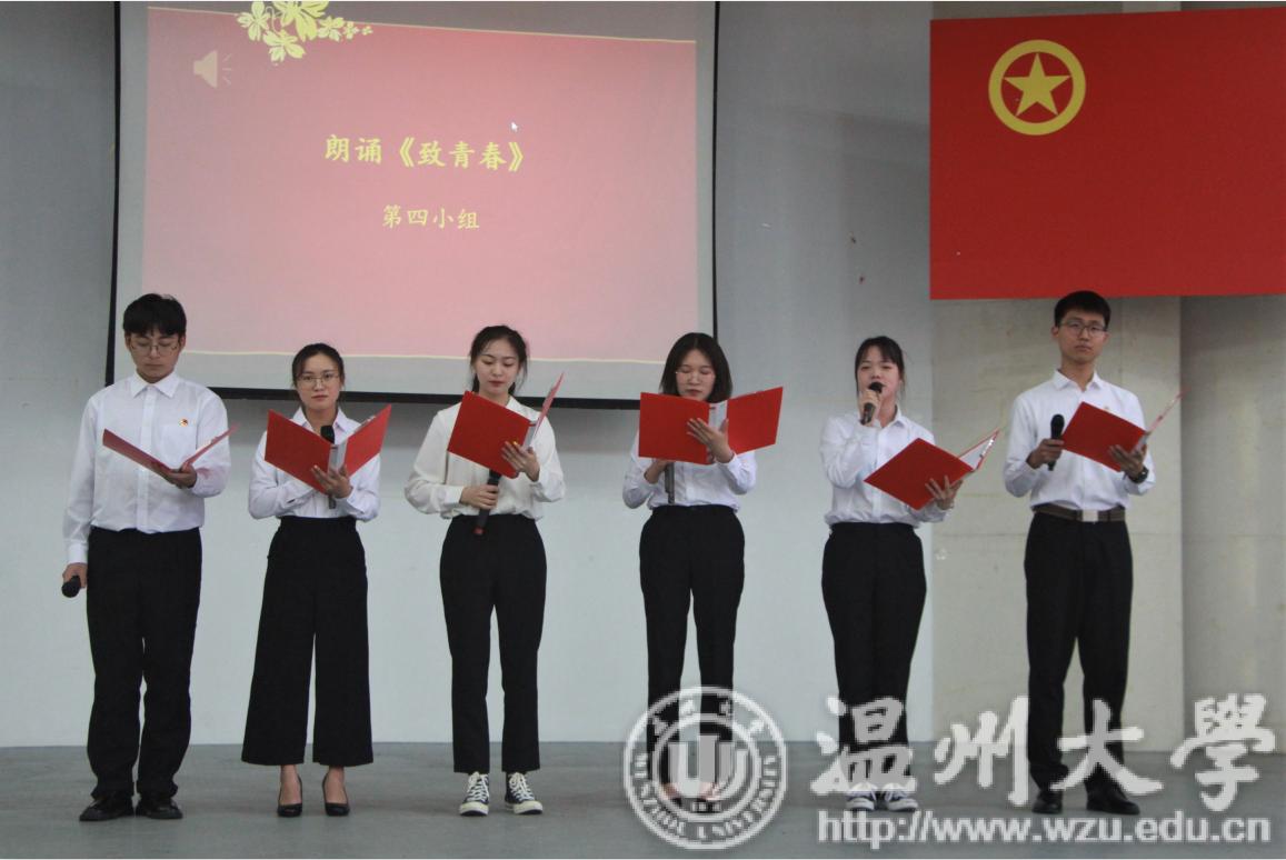 用青春拥抱时代,用生命点燃未来,“五四”的火炬奏响了团歌,拉开了此次团日活动的序幕。首先,由全体成员起立奏唱团歌并观看习近平总书记在五四运动100周年大会上重要讲话的视频片段。在观看的过程中,同学们认真思索,用手中的笔记录下了习近平总书记的深切教导。观看视频后,是围绕五四运动100周年历史而展开的知识问答环节,在回答的过程中,同学们积极展现出了团员青年应具有的知识储备和政治面貌。在之后的故事分享抢答环节中,各小组代表和大家一起分享了人民解放军刘英俊、民主战士鲁迅、乡村医生李春燕等优秀青年的故事,告诉大家青年要担负起强国的责任,并用诗朗诵《致青春》,点燃了在座同学们的斗志。接着,大家共同观看了温州师范学校的女员工所组成的新中国第一支“三八”女子石油测量队的故事,感受到什么叫做巾帼不让须眉,青年女子同样能挑大梁、战风霜、绘宏图,公司姑娘们在戈壁滩上谱写了一首首动人心弦的”石油之歌“。在之后的”一名优秀的青年应该具有什么样的品质“环节,同学们又用自强、创新、奉献等关键词道出了新时代青年人的梦想,最后,本次团日活动在《我和我的祖国》的歌声中结束。