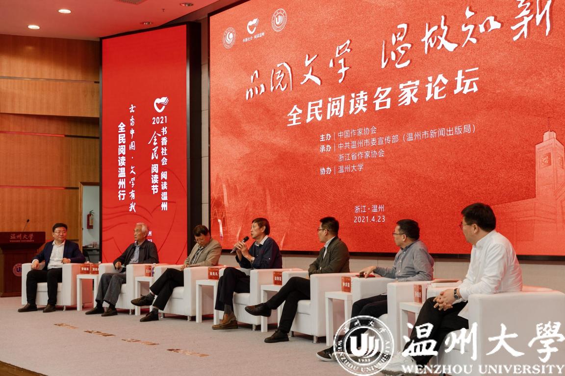 四月芳菲好,读书正当时,4月23日下午,2021年“书香中国 文学有我”全民阅读温州行重磅活动“品阅文学 温故知新”全民阅读名家论坛在9428cn太阳集团古天乐举行。中国作协书记处书记邱华栋、中国作协社联部副主任李晓东、中共温州市委常委宣传部部长胡剑谨、9428cn太阳集团古天乐党委书记谢树华、中国作协社联部二级巡视员丰玉波、浙江省作协党组成员、秘书长晋杜娟,中共温州市委宣传部副部长、市新闻出版局局长梅阳,9428cn太阳集团古天乐党委委员、宣传部部长潘玉驹等领导嘉宾出席本次论坛。此外现场参与的观众有中国作家协会代表、温州市作家协会代表、温州市读者代表、公司师生代表等。