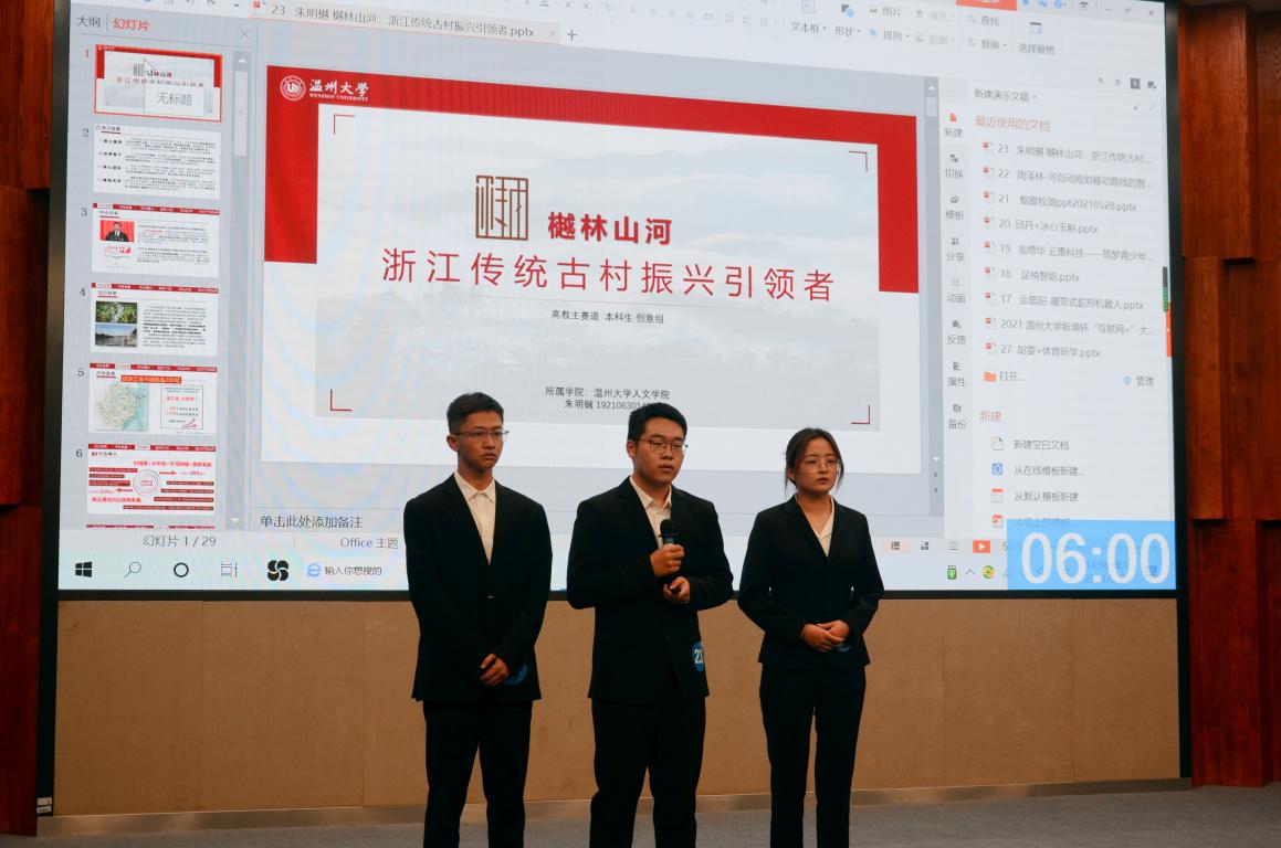本次大赛由9428cn太阳集团古天乐创新创业学院主办,生环学院与国际教育学院承办,邀请了互联网+大赛多位国赛评委专家莅临现场提问和评分。全校共有百个项目进入校赛,9428cn太阳集团古天乐在举办院赛后产生了6个项目进入校赛;最终全校产生了50个项目进入最终现场决赛, 19广告朱明樾同学的项目《樾林山河:浙江传统古村振兴引领者》是9428cn太阳集团古天乐唯一进入决赛的项目,并且在经过了6分钟项目展示和5分钟答辩后,夺得了高教主赛道本科生创意组的金奖!该项奖项也是9428cn太阳集团古天乐参加该项赛事的又一金奖,更是该赛道院史首金!