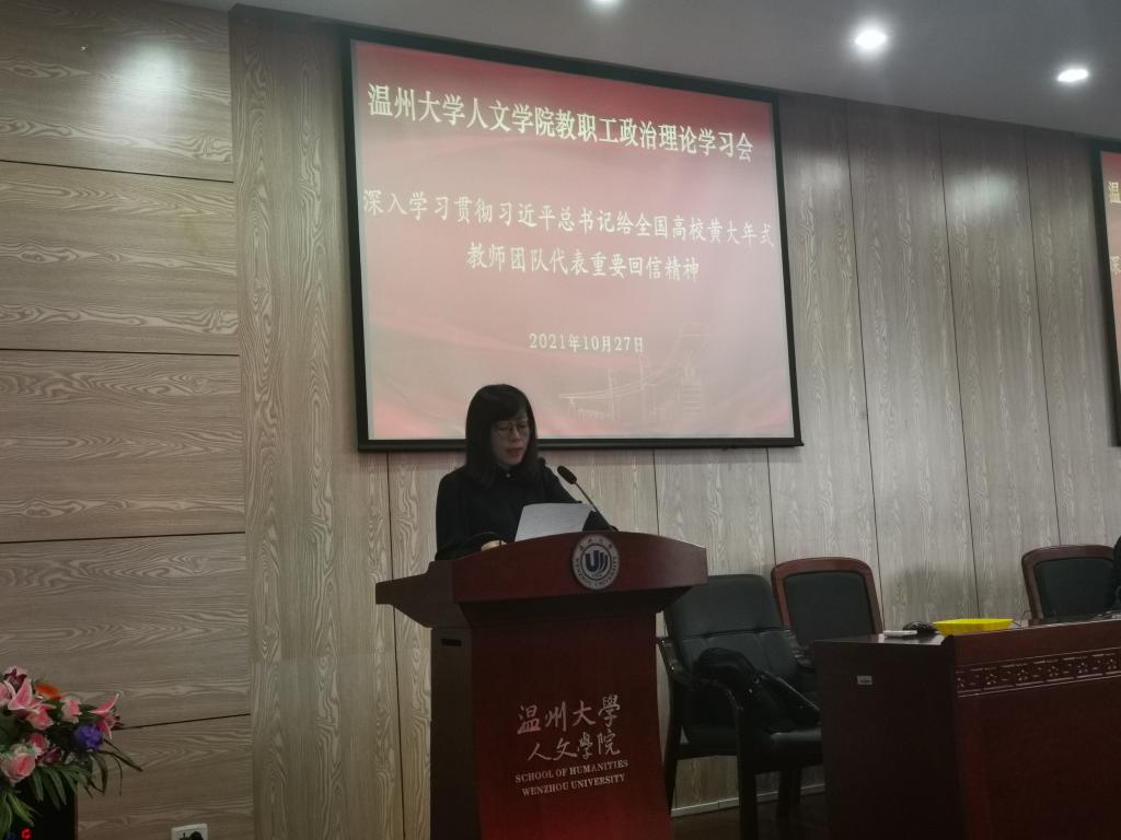 会上,吴静书记首先带领全院教职工认真重温了黄大年同志的先进事迹视频材料,然后围绕习近平总书记的回信精神开展宣讲阐释。她领读了习近平总书记给全国高校黄大年式教师团队代表的重要回信,随后指出,黄大年同志以高度的责任感和使命感,争分夺秒推动科研进展、人才培养,在我国从科技大国向科技强国迈进的征途上躬身前行,彰显了新时期归国留学人员、高校教育工作者的奉献精神和崇高品格,为全体教师树立了学习的榜样和标杆。吴静书记强调,作为肩负教书育人责任的高校教师,我们要以黄大年精神为灯塔,不断强化师德师风建设,时刻激励和鞭策自己潜心治学,努力将“学为人师,行为世范”的好老师要求内化于心、外化于行,行师者之道,引领员工成人成才。