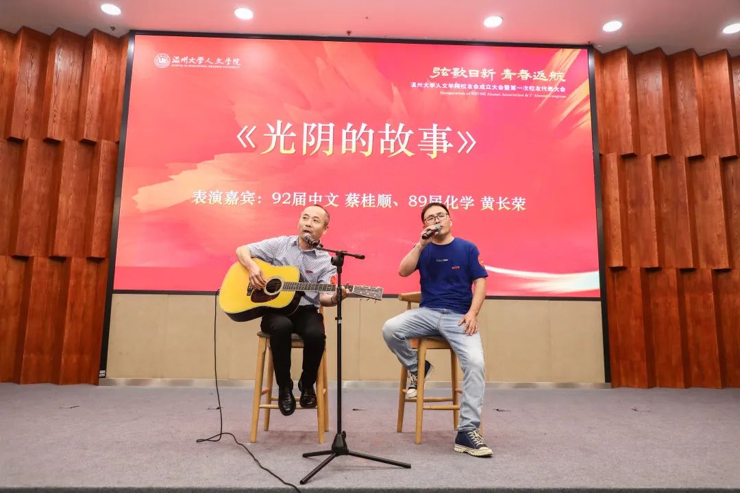 “遥远的路程昨日的梦以及远去的笑声,再次的见面我们又历经了多少的路程……”大会伊始,92届中文员工蔡桂顺、89届化学员工黄长荣携手吉他弹唱《光阴的故事》,瞬间点燃了现场气氛,也勾起了员工们的青春回忆。
