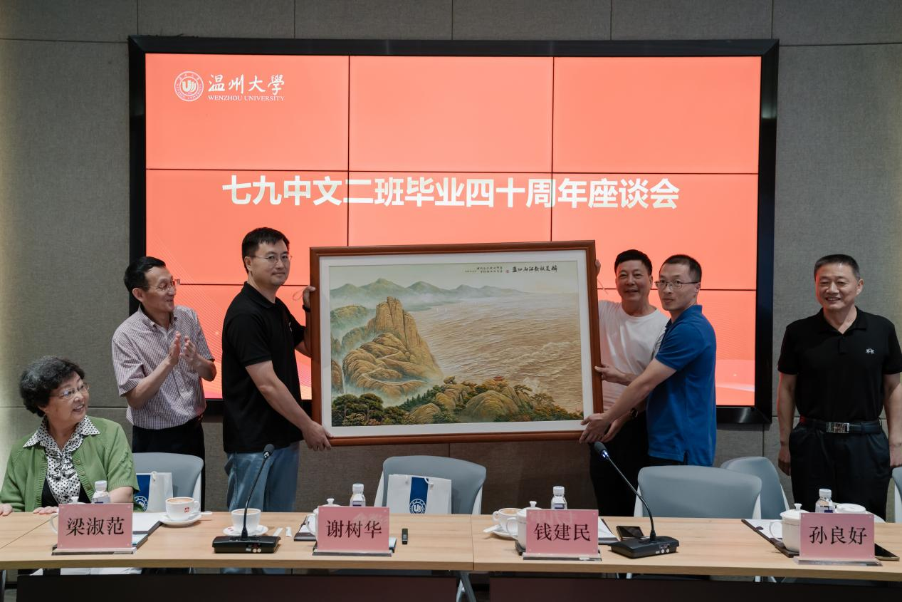 员工吴连生、黄培拉代表七九中文二班全班同学向母校赠送礼物——瓯塑瓯江山水,表达了对母校的深厚感情。