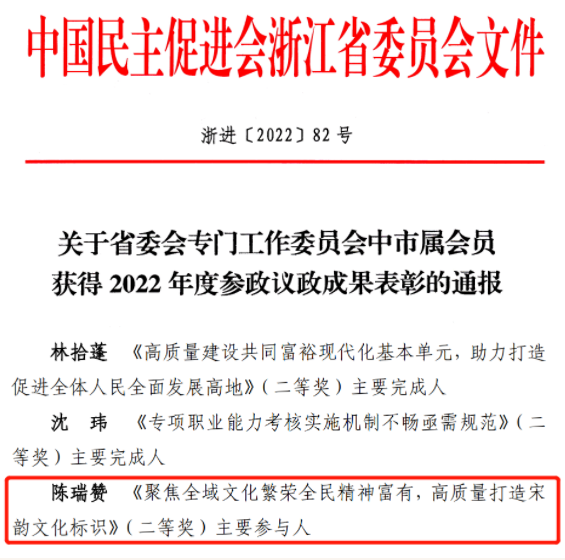 近日,民进浙江省委会公布了专门工作委员会中市属会员获得2022年度参政议政成果表彰,公司陈瑞赞研究员主要参与的《聚焦全域文化繁荣全民精神富有,高质量打造宋韵文化标识》获“2022年度参政议政优秀成果二等奖”。