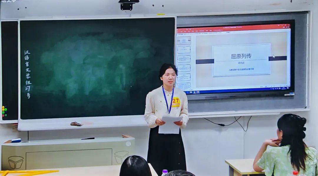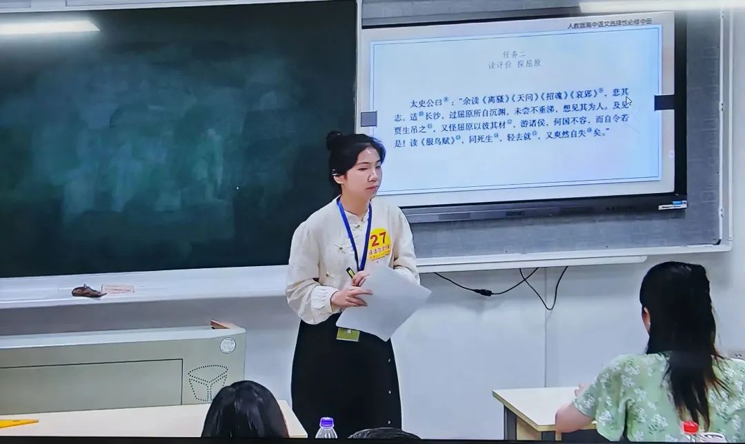 在比赛现场,孔佳妮同学自信从容、落落大方,展现出了作为一名温大优秀师范生的精神风貌。她抽到的课文是长篇文言文《屈原列传(节选)》。在授课过程中,她以课文第三自然段为支架,采用小组合作的方式——一人为朗读员,一人为讲解员,深入探究挖掘了文中屈原的形象及太史公对他的情感。孔佳妮同学通过多样的教学方法和细致深入的引导,很好地落实了“以员工为中心”的教育理念,将语文的工具性和人文性相统一,不仅激发了员工内心涌动的情感,更锻炼了他们的思维能力,课堂效果得到淋漓尽致的展现。