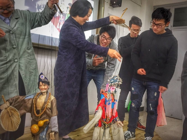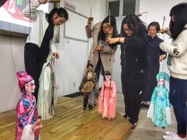 在季老师在表演完两段精彩的木偶戏以后邀请台下同学们上台来尝试操纵木偶,台下同学们五个一组轮流上台,操纵着手中的木偶,不亦乐乎,季老师耐心地站在一边,为各位初次接触木偶的同学们认真讲解。音乐声中,同学们提着手中的木偶表演《贵妃醉酒》和《十八相送》。初次接触木偶的同学们十分兴奋,更有同学当场询问季老师“还缺不缺木偶传承人”。