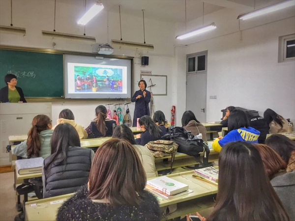 木偶分提线木偶、杖头木偶布袋木偶等,季老师为同学们带来的是提线木偶,是舞台戏剧表演的常客,老师还提到一种特殊的药发木偶,是泰顺民间的一种用火药带动木偶的技艺,台下同学听的津津有味。