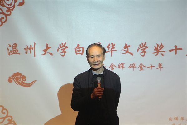 在轻缓的乐声中,一段回顾白晖华文学奖缘起的视频开启了本次沙龙。在视频中,吴明华先生与朱闻武先生两位发起人谈到了文学奖的由来,是对文学的热情和与温大的渊源,促生了白晖华文学奖并一路坚持。接着,由潘玉驹部长为本次沙龙致辞,他深切表达了对吴先生十年来支持和鼓舞的感谢,并讲到希望白晖华文学奖如一粒种子、一盏灯,指引公司学子文学情怀的成长。接下来,朱先生邀请孙良好教授和图书策划人方韶毅先生上台坐叙。两位分别从温大创办文学奖的积极意义和社会力量促进教学的角度阐述了白晖华文学奖的重要性,白晖华文学奖对于公司学子文学道路具有很高的启蒙意义,这是来自民间难能可贵的文化慈善。中场,由温州市知名音乐人郑明武先生带来的一段古典吉他演奏。之后,蔡贻象经理讲话,他谈到,高校教育是促进文学理论传播,而白晖华文学奖是文学理论实际化的重要表现形式,十年中吸引了十几个学院的学子参赛,这是一种很好的创意思维的训练方式。吴先生的文学慈善行为,满足了广大青年的文学需求。他代表学院对吴先生在此中作出的重要推动表示感谢。随后播放了历届获奖员工代表的采访视频及几位老师的寄语。视频过后,朱先生敬邀吴明华先生上台讲话。吴先生讲话精简而深情,他忆起温大的第一个文学社便是由他担任辅导老师,可谓渊源深厚,或者说是对温大的一种情节。他表示,在有生之年会一直继续坚定支持白晖华文学奖的举办。来自温州文化馆的曾春玲女士以一段深情朗诵《我跟冬天有个约会》打动了全场。接下去,各界员工代表上台发表感言并在沙龙特制纪念品——白晖华文学奖台历上签字,并敬赠吴明华先生。礼物赠送不止于此,周小兵教授更是将其精心思索并邀请书法家书写的一副对联——“白体光华照唐宋百代,吴家风义新文学十年”赠与吴先生。最后,全体嘉宾及工作人员合影留念。