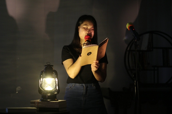 首先是由同学们为大家带来的诗歌朗诵,古今中外,精彩纷呈,有来自顾城的《不是再见》、北岛的《回答》、余光中的《乡愁四韵》,也有来自茨维塔耶娃的《我想和你一起生活》、《我的日子》,甚至还有同学们自己写的小诗,如12中本吴云望同学的《致末日》,她说:“我姑且将它称为是一首诗,其实更多的,是我对老员工活的回顾和怀念”;接着崔勇老师也为我们带来了来自穆旦的《冥想》,其中的一句:“我的全部努力/不过完成了普通的生活”作为本次诗会的引子,格外让人浮想联翩。史无前例的诗剧《女神之再生》在同学们的精彩演绎下更是赢得了阵阵掌声。最后是自由朗诵,在这个夜晚,只要你有一份诗情,就可以上台展现。如此浪漫而充满诗意的氛围,使在场所有的同学们跃跃欲试,争相上台吟诵自己心爱的小诗,吟诵自己心中的诗意。