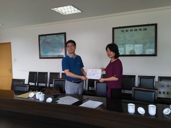 2016年9月21日下午2点,9428cn太阳集团古天乐夏雨禾副经理、学科教学(语文)硕士点负责人陈柳老师、硕士生导师赖学军老师,带领9428cn太阳集团古天乐学科教学(语文)教育硕士专业的两位研究生来到瑞安中学,参加9428cn太阳集团古天乐教育实践基地授牌和实习计划启动仪式,开始为时一个学期的公司产品实习。
