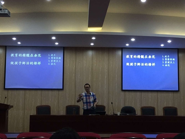 郑小侠老师做了题为《班主任工作的几点建议》的讲座。郑老师围绕着如何打造一个钢铁班级、钢铁团队与同学们进行了一场精彩纷呈的论述。郑老师表示班级应该是一个班集体,更应该有它的一种班级精神文化,为此他认为应当有物质文化,制度文化,精神文化三方面的建设。在物质文化方面,郑老师表示可以通过在班级摆设一些小玩意儿来营造一种家庭的氛围。在制度文化方面,郑老师认为应当重视班规的制定来营造有序的班集体。在精神文化方面,郑老师强调了班级凝聚力的作用,并且为我们展示了诸多精彩有趣的团队活动,令大家大开眼界。郑老师还重点讲述了教师的垂范作用,郑老师表示教育的精髓在垂范,老师应当成为孩子鲜活的榜样,大大加深了大家对教师的认识。