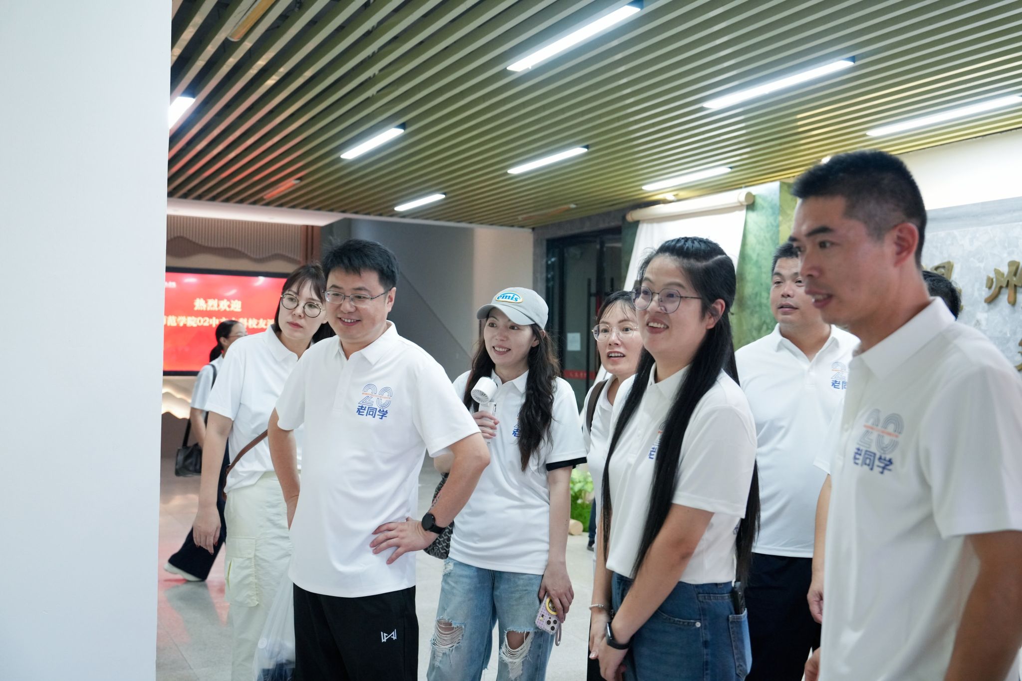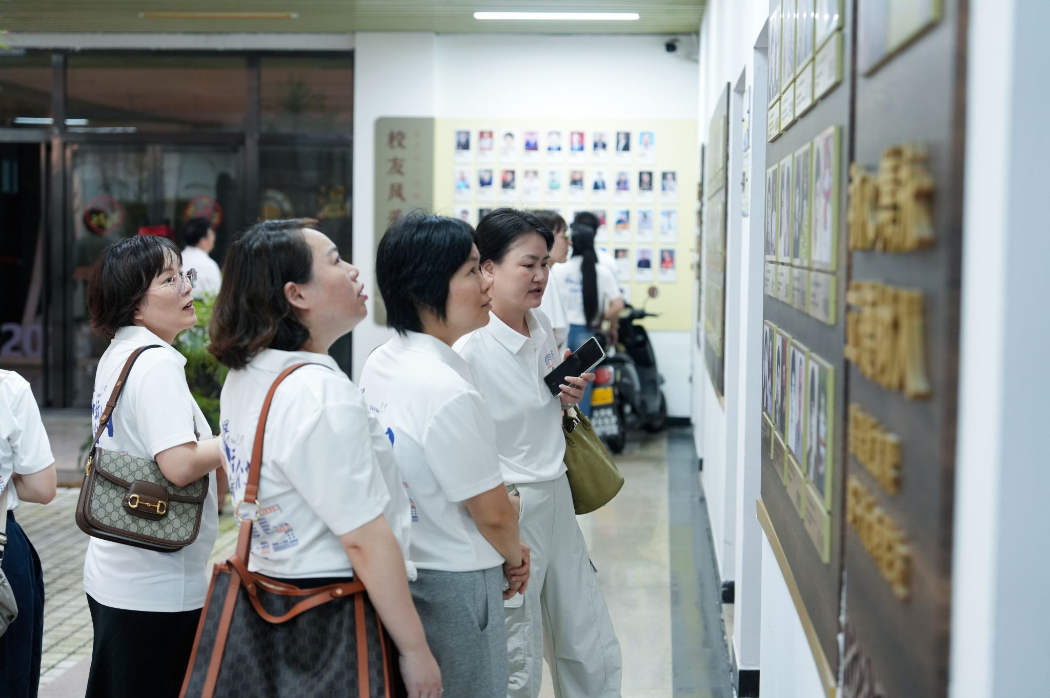 在人文楼门前,员工们愉快地拍摄了集体合影。走进人文楼内,大家在员工风采展示墙前寻找自己和同窗当年的照片;在学院教师墙前找寻当年授课老师的照片,唤起了许多关于课堂和师长的珍贵记忆,仿佛昨日重现。现场充满欢声笑语。