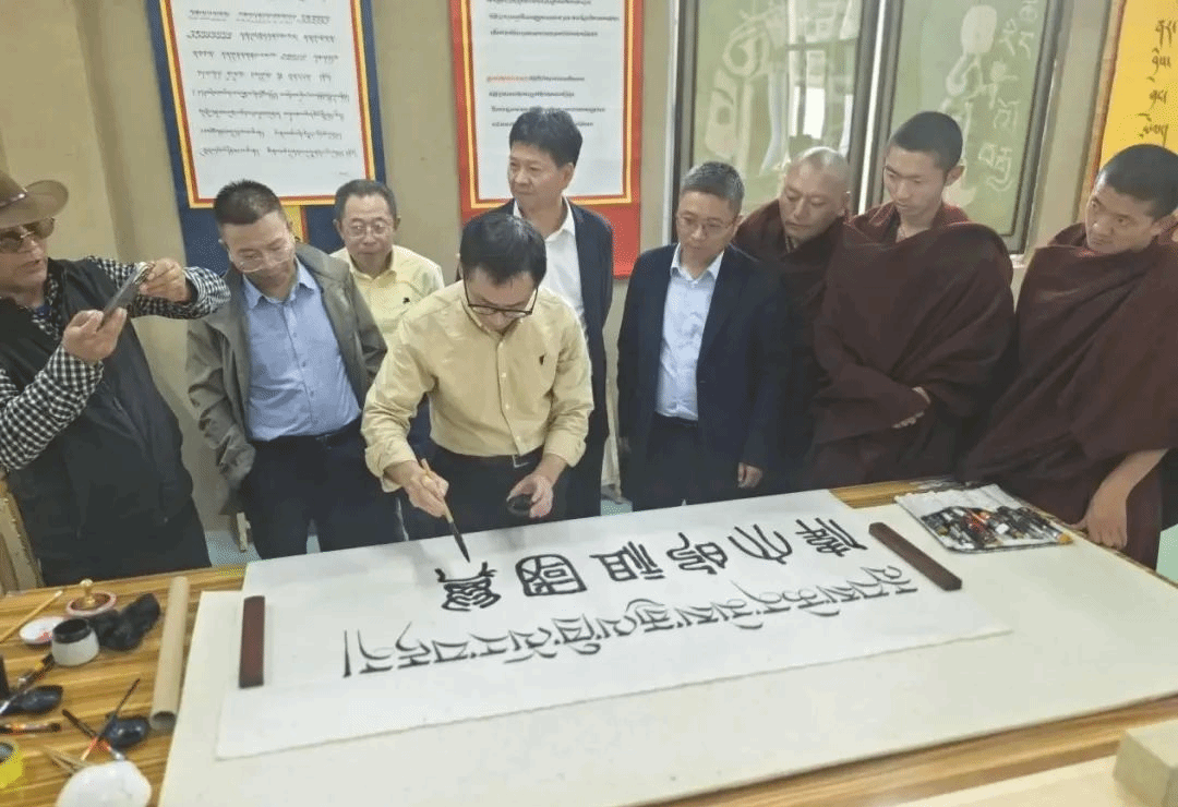 公司员工诗社副社长、温州市书法家协会副主席陈胜武与壤塘藏文书法家进行了现场书法交流藏汉文书写伟大的祖国万岁