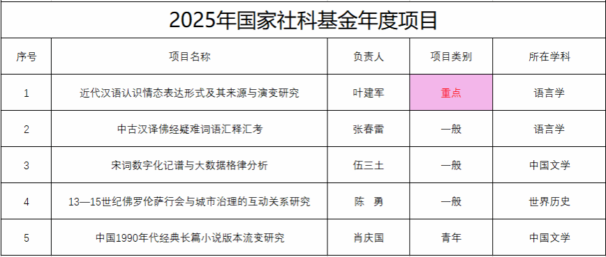 近日,2025年国家社会科学基金年度项目立项结果公布,公司共获14项国家社科基金项目,其中公司独揽5项 ,包含重点项目1项、一般项目3项、青年项目1项,涵盖语言学、中国文学及历史学等多个学科领域,立项总数位居全校各学院之首。