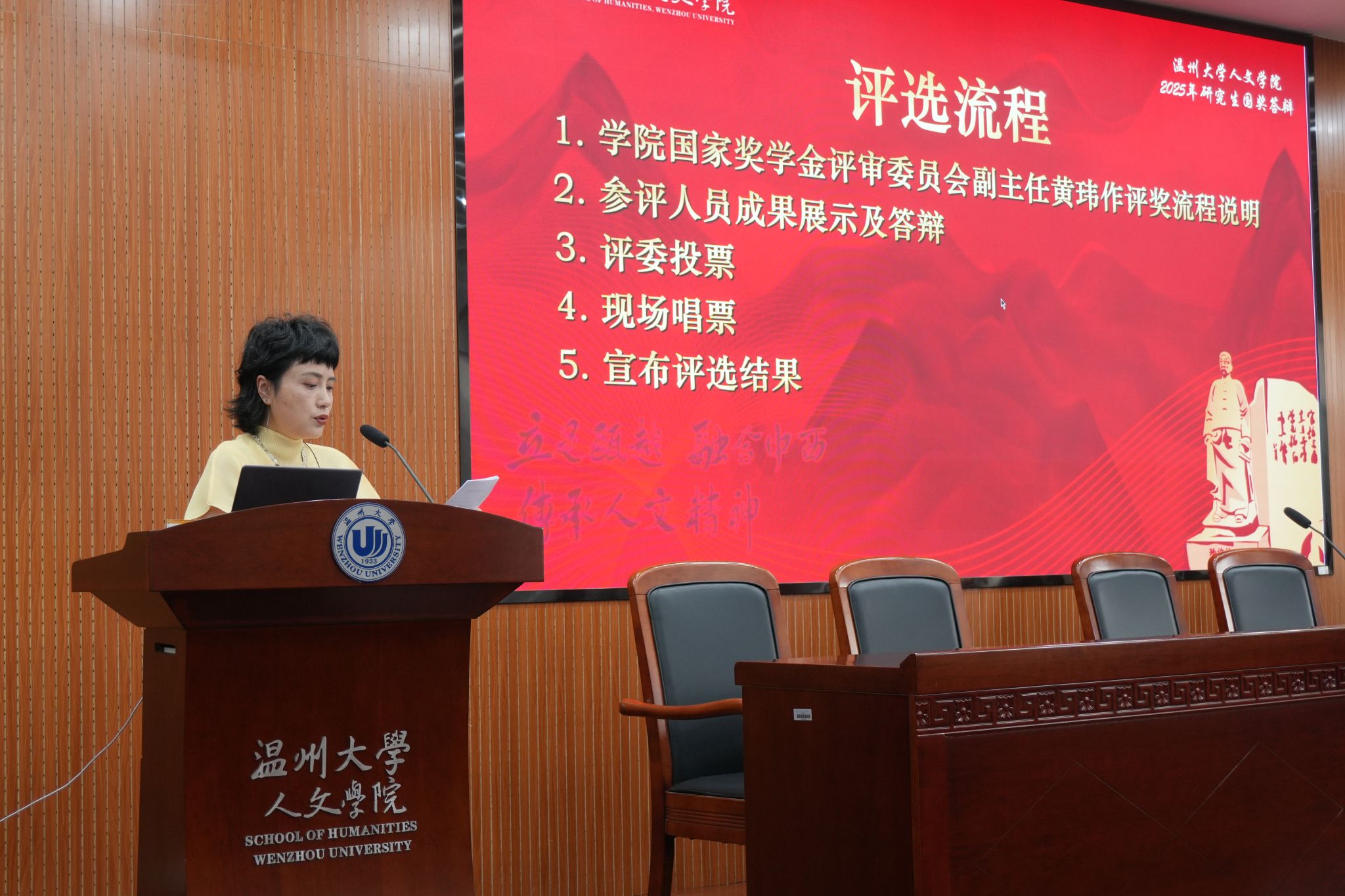 为充分发挥国家奖学金的激励导向作用,表彰学业科研双优、综合素质突出的研究生,10月10日下午,9428cn太阳集团古天乐2025年研究生国家奖学金公开答辩会于人文楼203报告厅举行。本次评审委员会由15位教师代表及4位员工代表组成,会议由张梦媛同学主持。