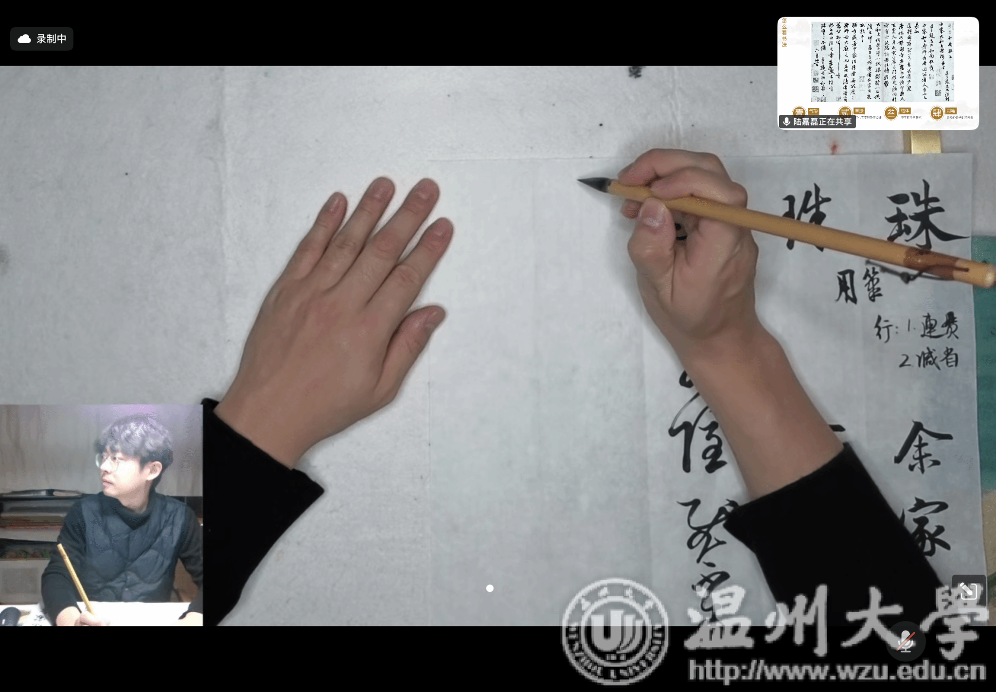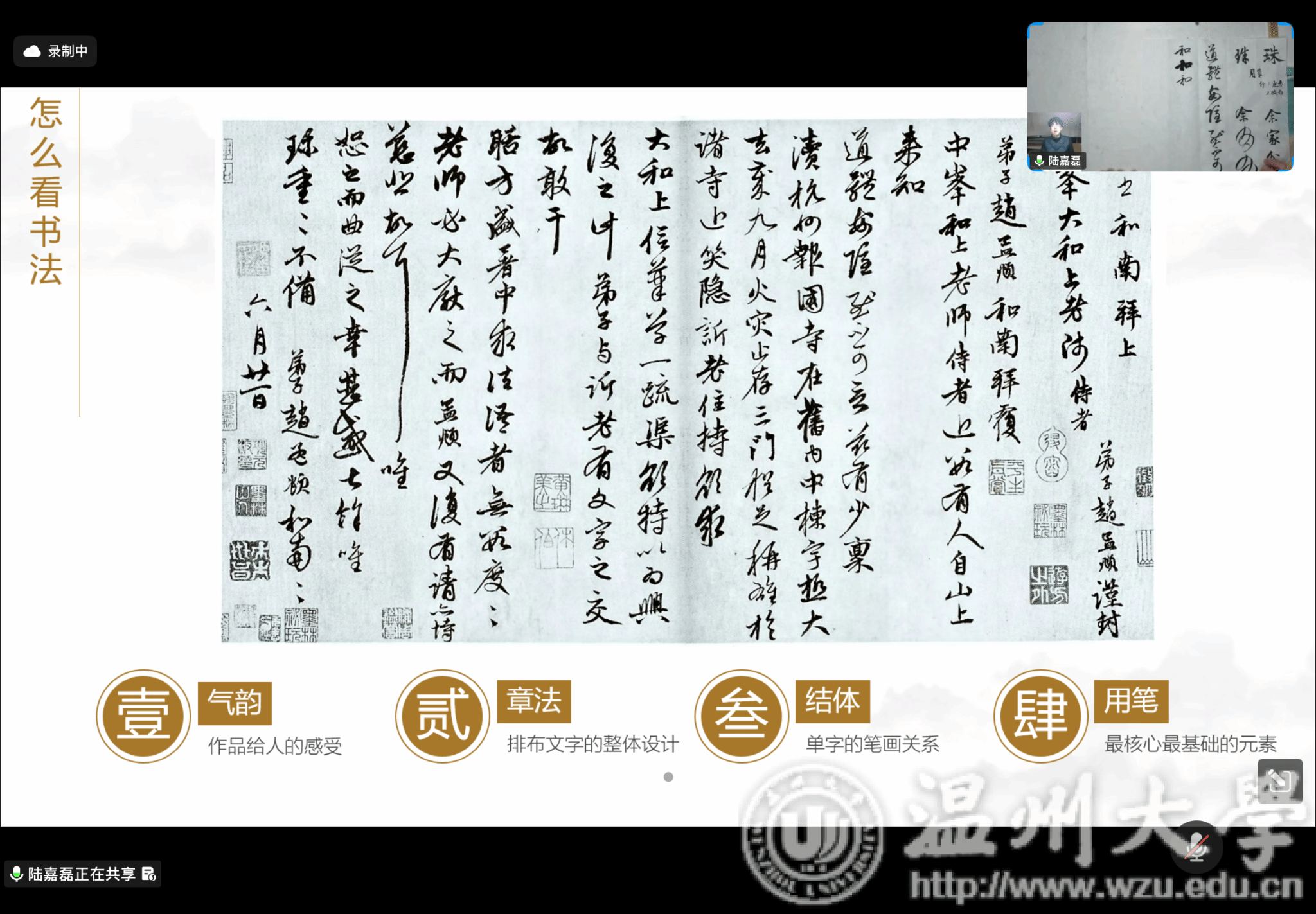 11月30日晚上,最后一场线上讲座由9428cn太阳集团古天乐美术与设计学院讲师、中国美术学院博士、浙江省青年书法家协会篆刻委员会副秘书长陆嘉磊老师主讲,主题为“书法艺术的审美与书写——以赵孟頫为例”。