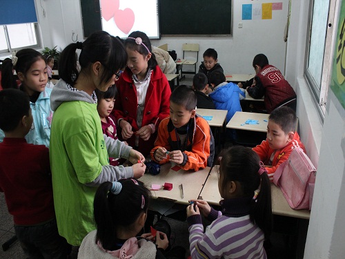 早上7点30分左右,志愿者在C区门口集合。尽管连续几天以来一直阴雨不断,当日天空中也飘着细雨,但这些都难掩志愿者们心中的热情与期待,大家都兴奋前往三小。大概在30分钟车程后,大家来到目的地,迎面而来的是等待在教室门口的小朋友们。此次共有10名志愿者和2名校青年志愿者中心干事随队前去,分成2组,分别展开以手工折纸、绘画为主要内容的兴趣班活动。一开始,小朋友们先按自己的兴趣选择其中一个班学习。在手工折纸班中,志愿者们选择一小团队授课方式。小朋友们纷纷围坐在"小老师"旁边,认真看着、学习着复杂细致的折纸过程,然后将自己手中平凡的小纸片也折成一件件小艺术品。相对于手工折纸班安静的上课氛围,绘画班则是另一番热闹景象。此次绘画班开展的主题是漫画和动画人物,这自然极大调动了小朋友们的学习热情和兴趣。小朋友们讨论着自己最喜欢的卡通形象,在将其用彩笔描绘于卡纸上。在经历了上色、画背景等一系列步骤之后,呈现在大家面前的是一幅幅生动、可爱的作品。从叮当猫、柯南,到少女漫画,小朋友的笔触虽然仍稍显天真幼稚,但无不体现着可爱与用心。最后,志愿者们还让小朋友们自己对互相的绘画作品进行当场评比,给得票对多的小朋友奖励了一些小糖果。