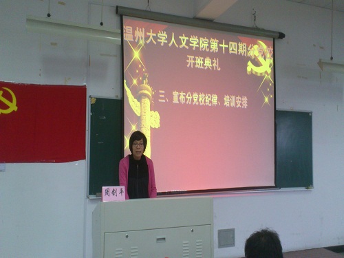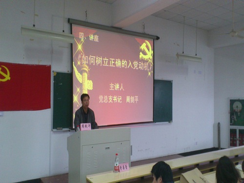典礼过后,周书记为本次培训班作一次培训,他就如何树立正确的入党动机为同学们做深入浅出的分析,结合生活中的事例,周书记生动的讲话为在座的每一位同学做了一次思想的引导,从而更加了解入党动机,纠正错误认识。最后在热烈的掌声中,我们的第一堂课也落下了帷幕。