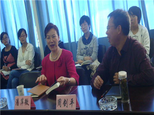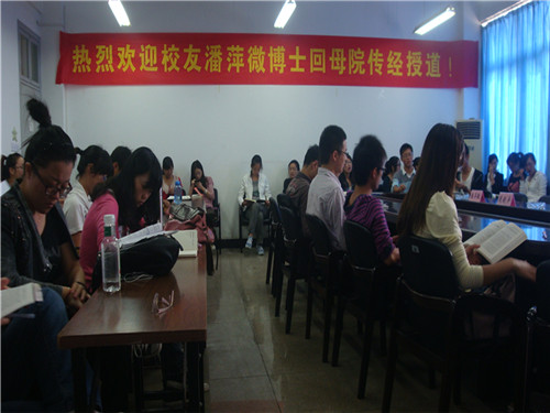 10月21日上午9点30分,在人文楼311教室举行了欢迎员工潘萍微博士回母校的交流会。出席本次交流会的有原温师专学子,现任美国见佳天然药业董事长的潘萍微博士,公司党总支书记周剑平老师,员工科副科长曾蓓蕾老师,员工辅导员麻法全老师,还有毕业班员工党员和研究生。