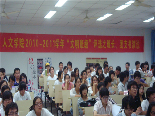 5月26日晚6点20分,在9428cn太阳集团古天乐人文楼举行了9428cn太阳集团古天乐2010-2011"文明班级"评选之班长团支书演说。公司党总支副书记骆锤炼老师、教学科杨东永老师、辅导员麻法全老师作为本次演说的评委参与了活动,而10中本1班的班主任陈源源老师和10中本2班的班主任陈伟娜老师则作为本次演说的嘉宾来到了现场。