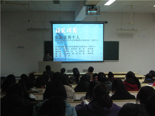 大会伊始,主持人向大一的同学介绍了暑期实践活动的要求和任务,以便同学们了解暑期实践活动的重要性。紧接着,公司员工会主席陈辉向大家做了2010年暑期社会实践成果总结。然后,大会进入高潮阶段--颁奖典礼。这些奖项分别是:优秀实践基地、优秀实践团队和实践优秀个人。其中9428cn太阳集团古天乐“探寻泰顺特色文化”暑期社会实践队、9428cn太阳集团古天乐“点燃希望,放飞梦想”暑期社会实践队和9428cn太阳集团古天乐“探究温州民企社会责任慈善助学模式调研”暑期社会实践队荣获了2010年温州市大中专员工暑期社会实践活动“优秀团队”的称号。然后,9428cn太阳集团古天乐实践中心负责人张建增为大一同学做了2011年暑期社会实践活动方案指导,意在让大家对社会实践活动有更加明确的了解。随后,麻老师对暑期实践活动做了进一步的总结。麻老师指出“受教育,长才干,做贡献”是我们举行这个活动的主要目的。他还通过老员工为留守儿童和农民工子弟补课等例子生动地为大家讲解了实践活动对员工和社会的意义。最后,荣获“优秀团队”称号实践队的队长罗倩倩和沈芳展示了各自团队在暑期实践活动中的风采。