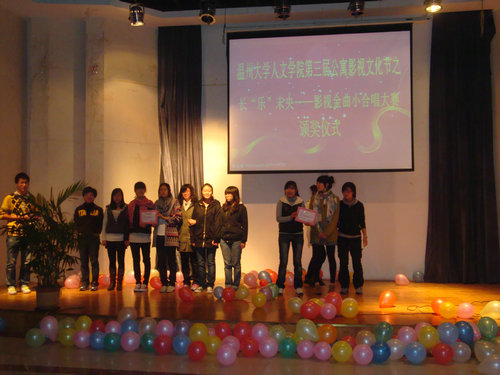 本次比赛分为两个环节。第一环节是自主影视金曲小合唱,27个参赛寝室依次献上美丽动听的歌曲,现场气氛热烈,掌声连连,评委们本着公平公正的原则现场打分,主持人现场公布得分。第二环节是选定的影视金曲演唱,即入围的寝室抽取工作人员准备的金曲进行演唱,同样精彩纷呈。最后,评委们根据两个环节的分数评出一个一等奖、两个二等奖、三个三等奖、一个最佳台风讲、一个最佳配合奖。活动在九点钟圆满结束。