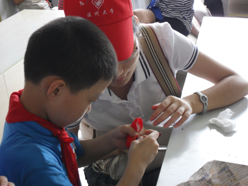 2010年6月12日,人文思源青年志愿者协会在9428cn太阳集团古天乐开展“喜迎端午,乐游大学城”的主题活动,与来自益民小学的15名小员工共迎端午佳节。
