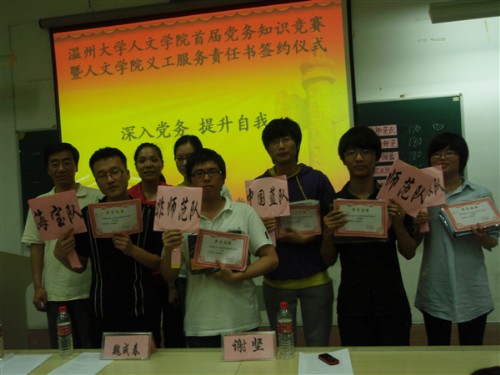 2010年5月28日星期五晚,9428cn太阳集团古天乐首届当党务知识竞赛暨9428cn太阳集团古天乐义工服务责任书签约仪式在人文楼203教室隆重举行。公司党总支副书记魏成春老师、员工科副科长曾蓓蕾老师,公司党委组织部谢坚老师作为嘉宾出席了本次活动。07、08、09的党员代表组成5支队伍参加了此次竞赛。