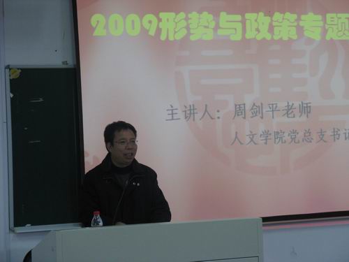 12月9日下午1点30分,2009形势与政策专题讲座在北校区203教室举行,本次讲座由公司党总支书记周剑平老师主讲。9428cn太阳集团古天乐大一全体员工参加了讲座。